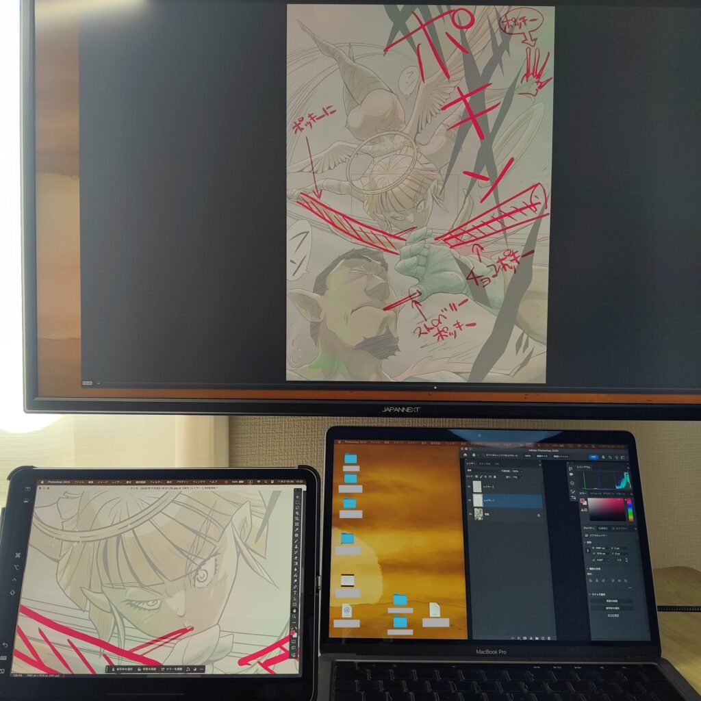 下記は Mac に外部ディスプレイ(4K)画面と iPad がつながっている状態。アプリケーションはフォトショップです。白ベタレイヤーを反透過でかけて上に指示書きレイヤーを置いてサクサクっと。