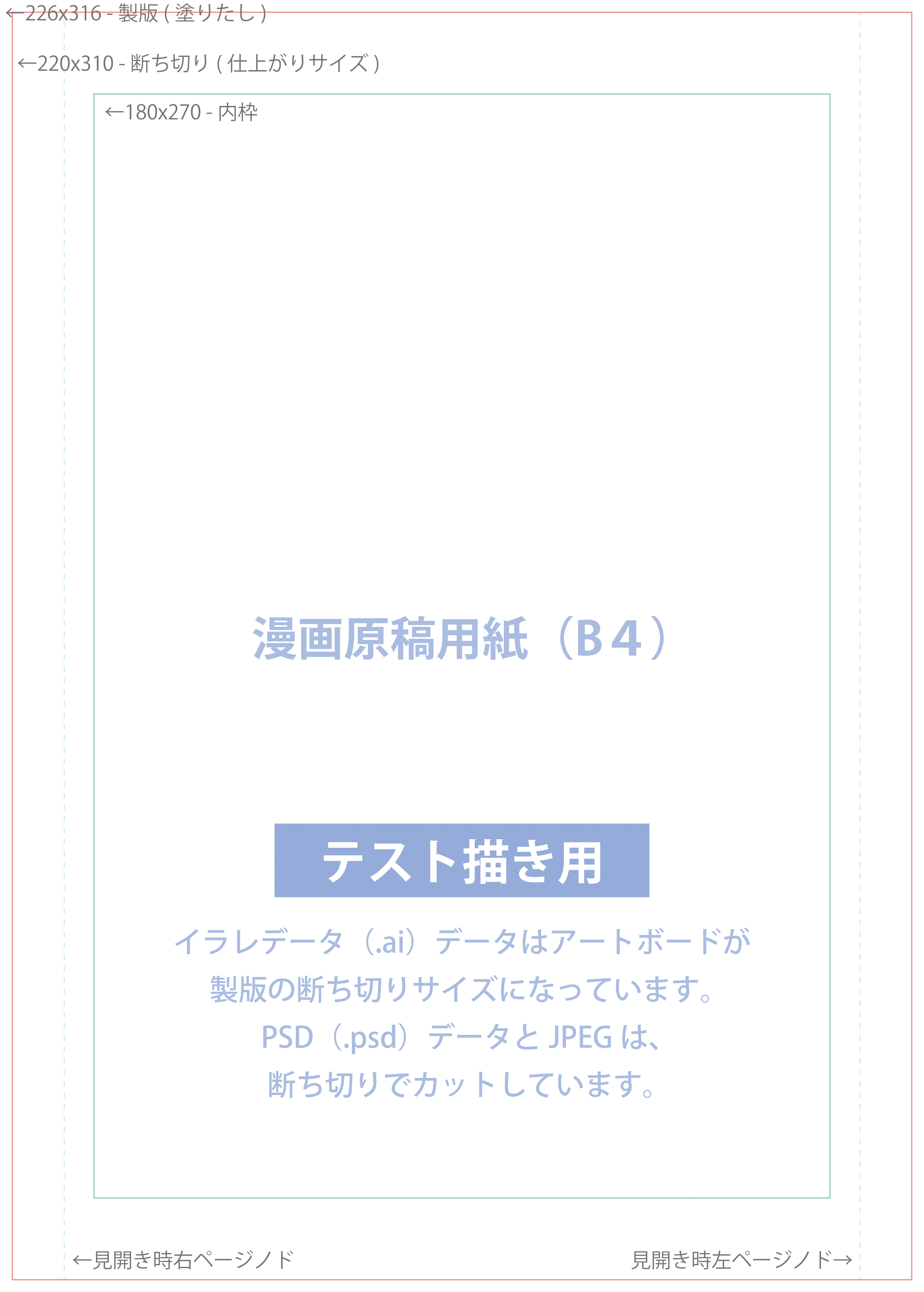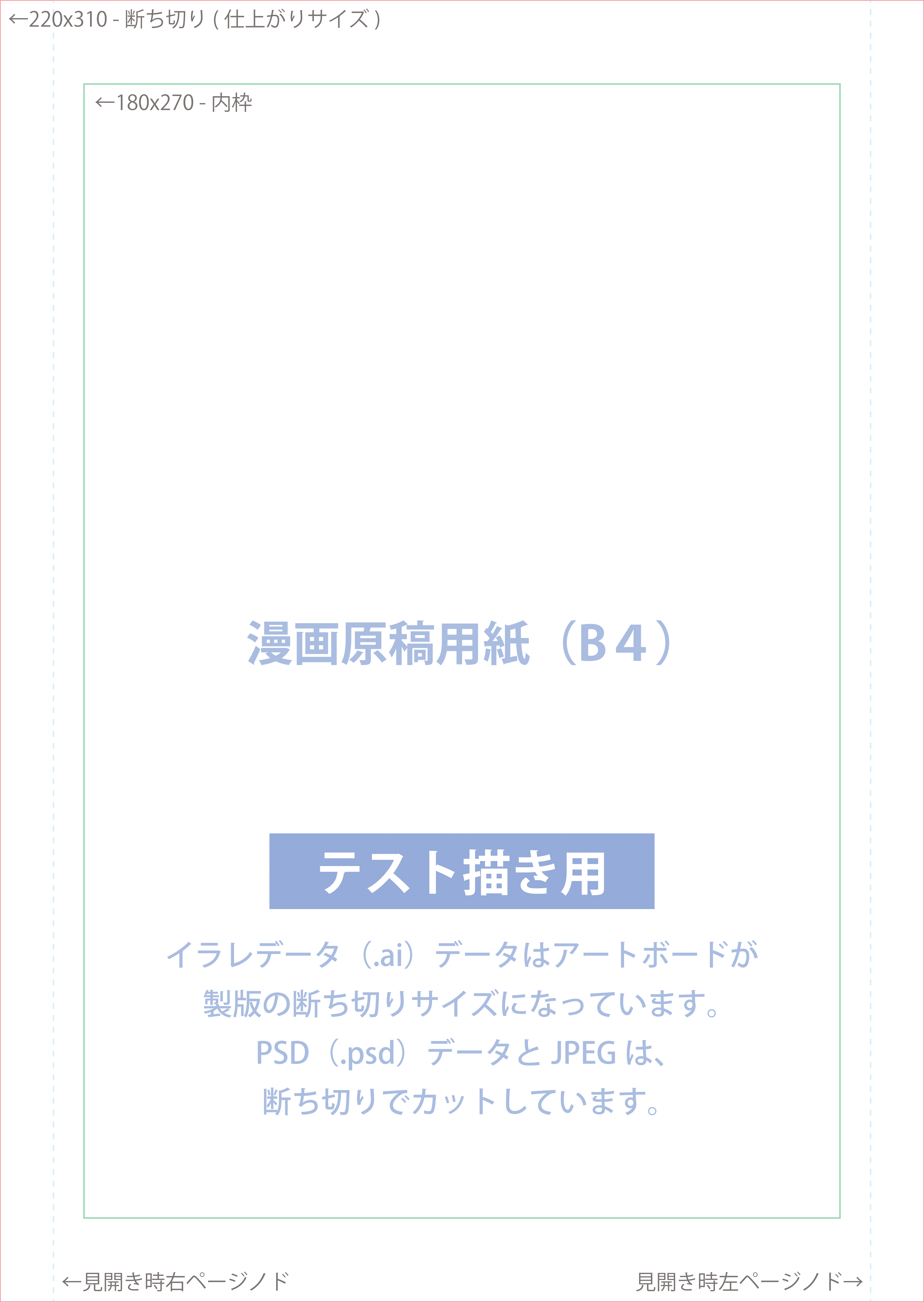 “製版サイズ漫画原稿用紙PSD(600dpi)” をダウンロード comic_b4_cutoff2.psd – 17 回のダウンロード – 34.53 MB “製版サイズ漫画原稿用紙JPEG(600dpi)” をダウンロード comic_b4_cutoff2.jpg – 16 回のダウンロード – 4.70 MB “製版サイズ漫画原稿用紙AI(AdobeIllustrator)(600dpi)” をダウンロード comic_b4_cutoff2.ai – 16 回のダウンロード – 1.88 MB上記のPSD版(comic_b4_cutoff2.psd)は2レイヤー構成でトンボのみのレイヤーも含めました。イラレへ貼り付けるときの目安にもなるかなと。